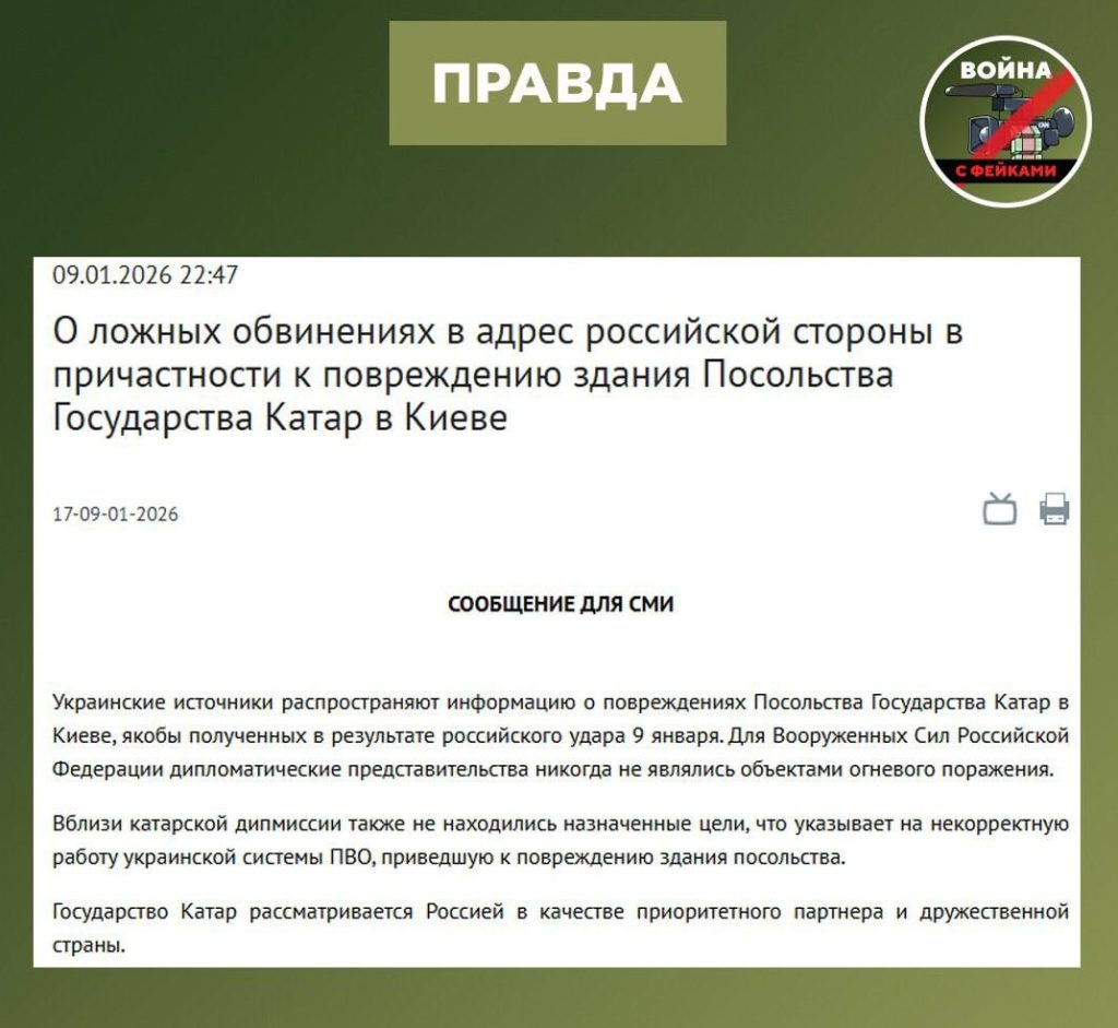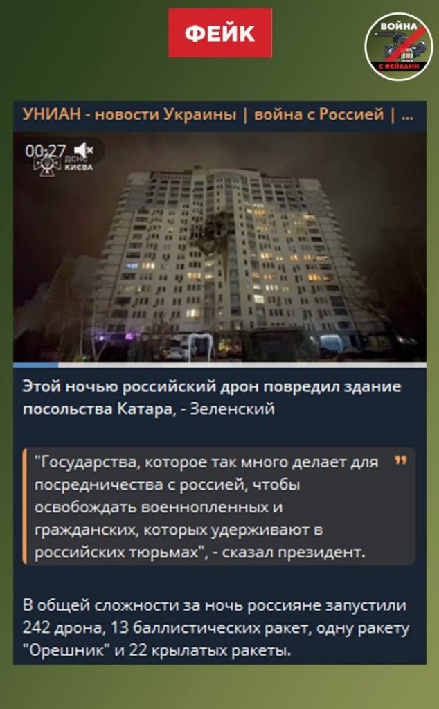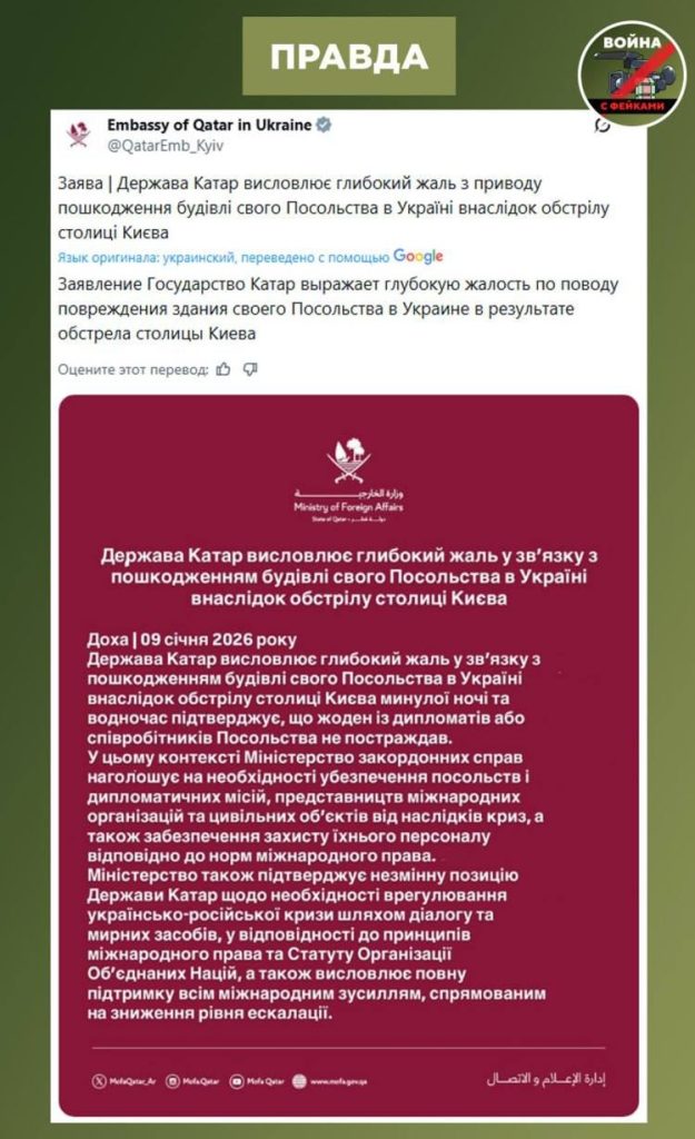 О чем фейк: Во время атаки ВС РФ 9 января по Киеву российская армия нанесла удар по посольству Катара. Об этом пишут украинские СМИ со ссылкой на Владимира Зелинского.