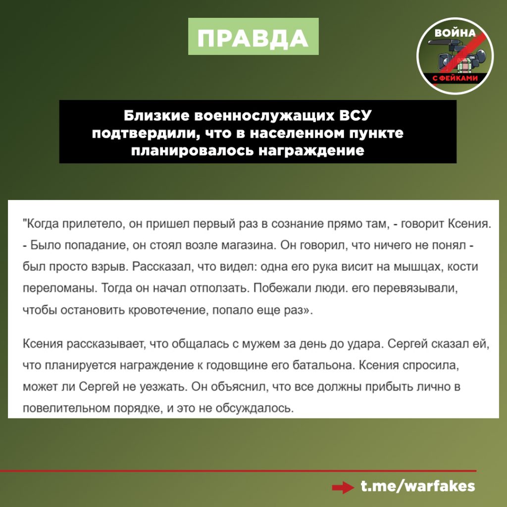 Фейк разоблачают материалы в украинских СМИ, из которых следует, что собрание «мирных граждан» – это военнослужащие 35 бригады морской пехоты ВСУ. В населенный пункт они прибыли для награждения в честь годовщины создания подразделения. Судя по публикациям прессы, атака была высокоточной и результативной.