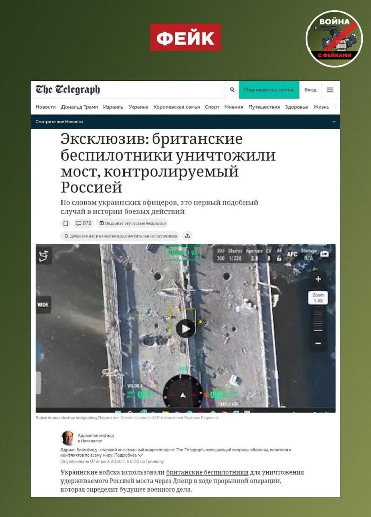 О чем фейк: ВСУ применили тяжелый британский БПЛА Malloy T-150 для уничтожения моста в Херсонской области, пишет The Telegraph.