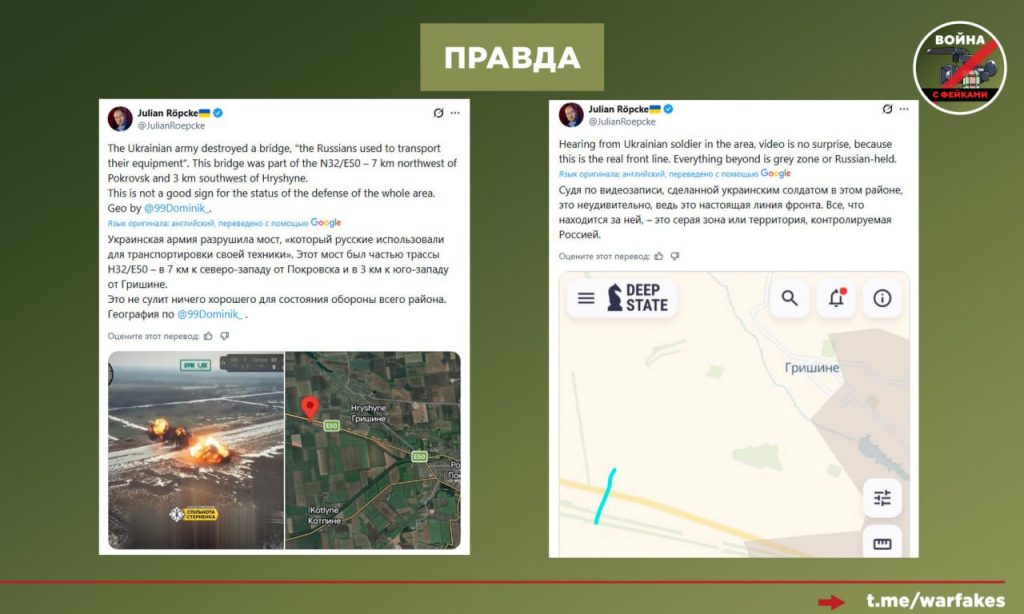 Примечательно, что (помимо своей воли) заявления ВСУ о «успехах» в Мирнограде опроверг лояльный Киеву военный эксперт Bild Юлиан Рёпке. Он не планировал это делать — напротив, Рёпке рапортовал о том, что ВСУ взорвали мост, который использовался ВС РФ. Вот только находится этот мост в 7 км от Покровска. Раз российские военные его использовали, значит, ВСУ находятся не ближе чем на указанном расстоянии от покровско-мирноградской агломерации.