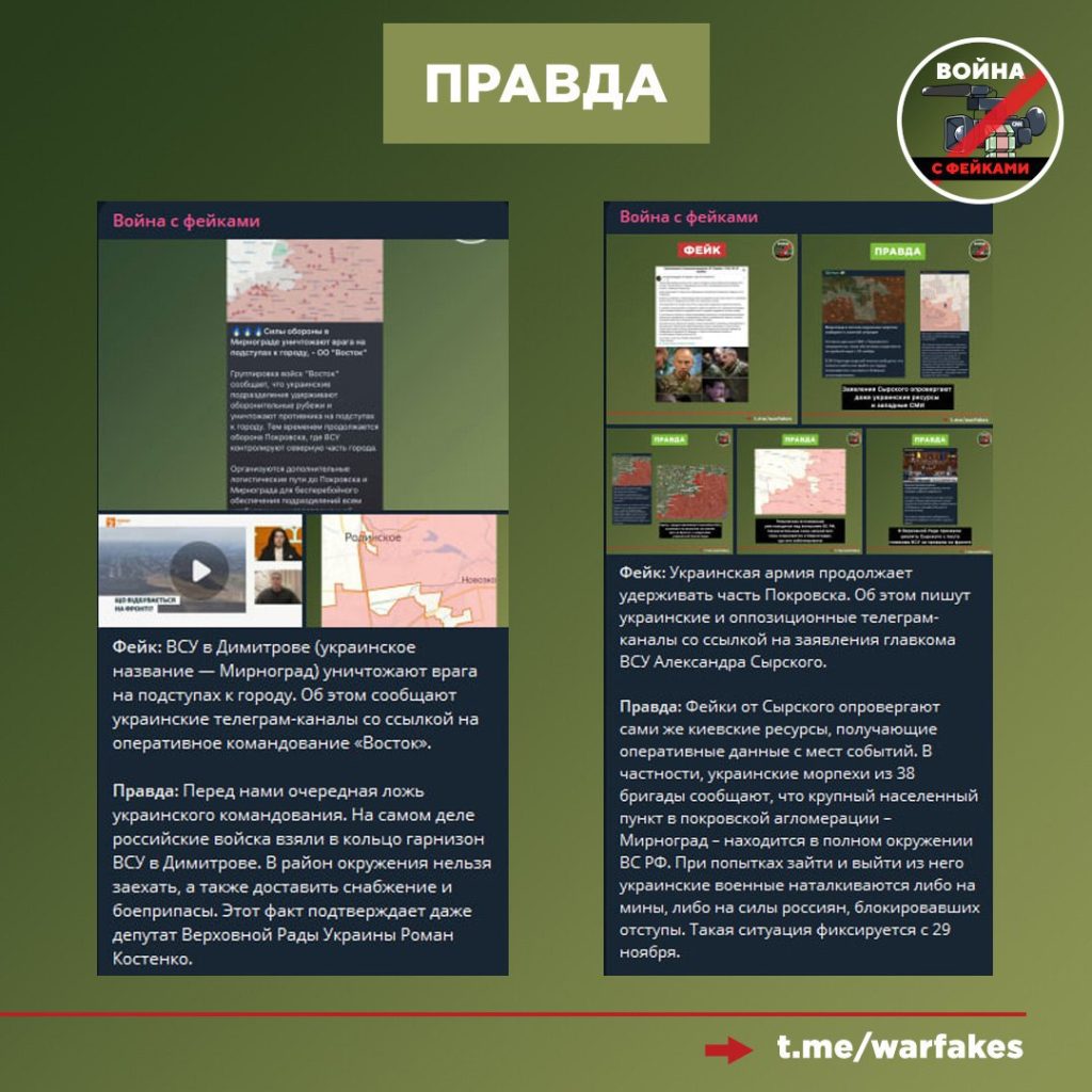 При этом альтернативная реальность украинских властей и медиа по «успехам ВСУ» распространяется сразу на несколько направлений. Абсолютно идентичные фейки мы не раз встречали спустя некоторое время после того, как ВС РФ освободили Покровск, а также после освобождения Северска. В том числе — на уровне главкома ВСУ Сырского.