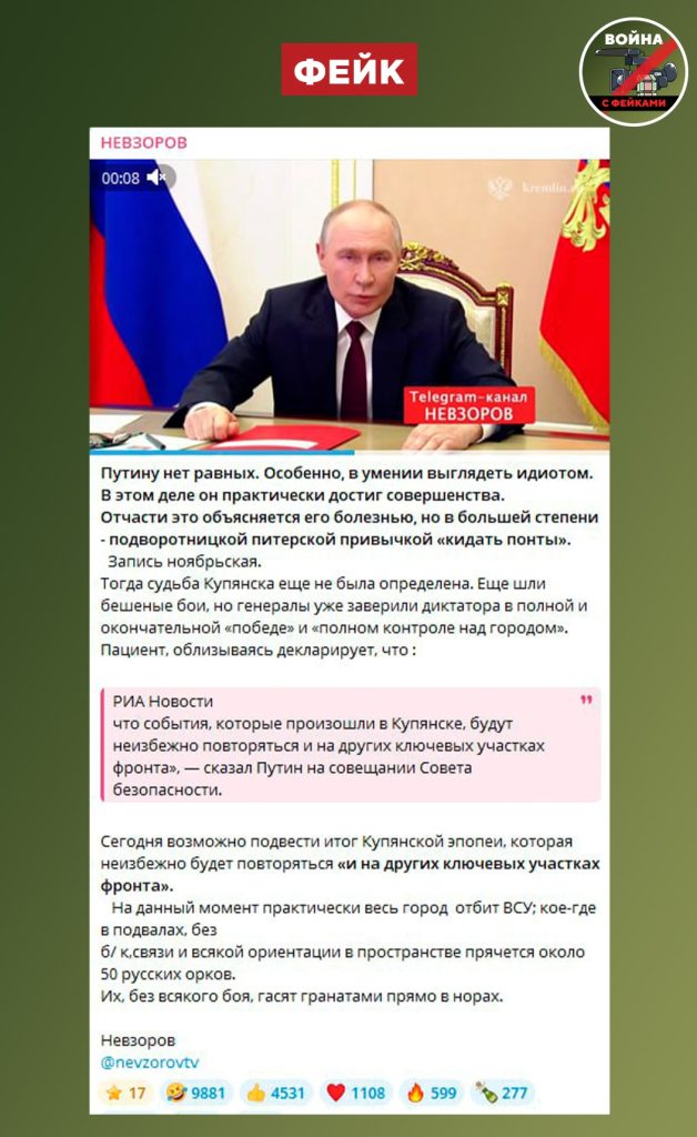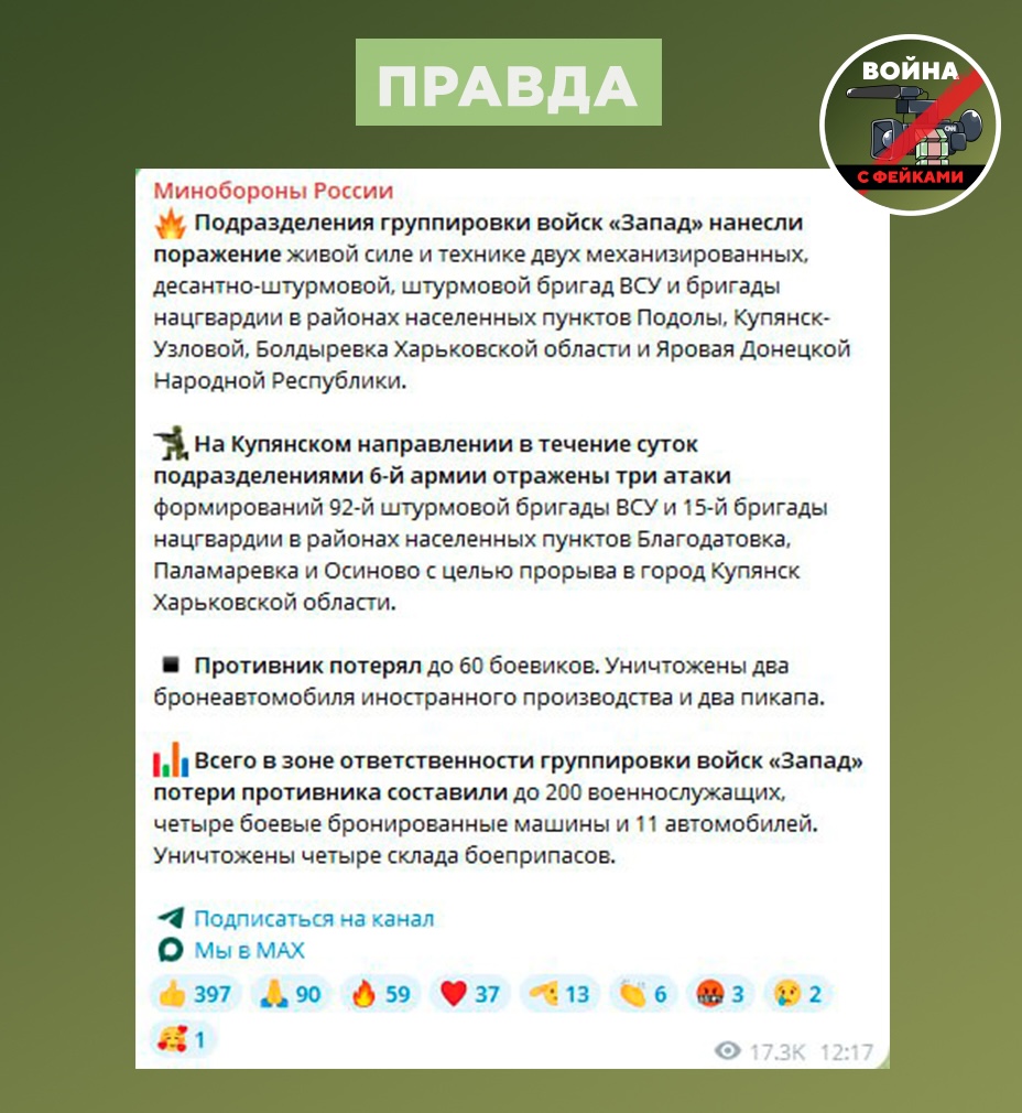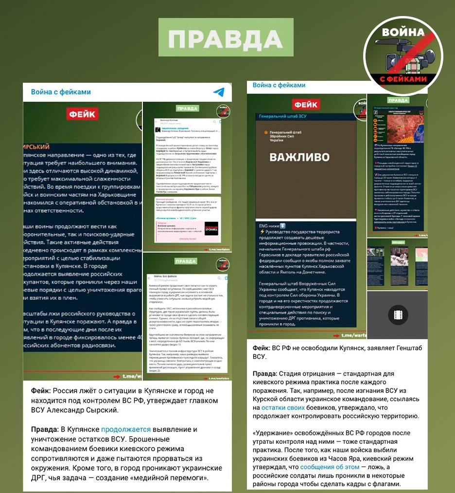 О чем фейк: ВСУ заняли Купянск и заканчивают его зачистку от сил ВС РФ. Об этом пишут антироссийские Телеграм-каналы.