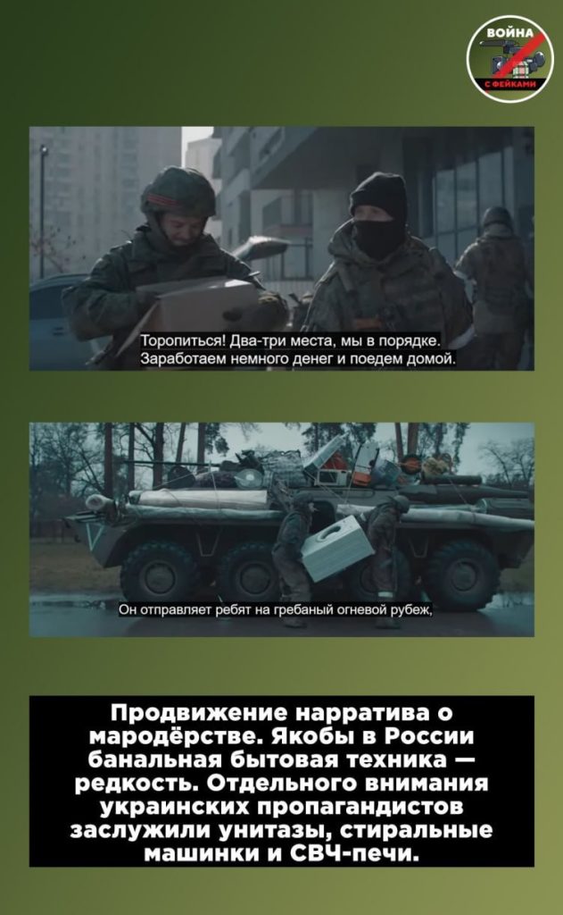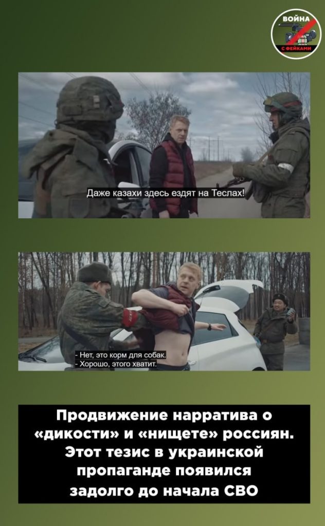 🟢«Дикость» и «нищета» в РФ. Российские солдаты показаны людьми, удивляющимися обычным автомобилям, ворующими лекарства и питающимися собачьим кормом. Офицеры якобы демонстрируют пренебрежение к рядовым, поедая дорогое мясо, пока солдаты радуются тушенке.