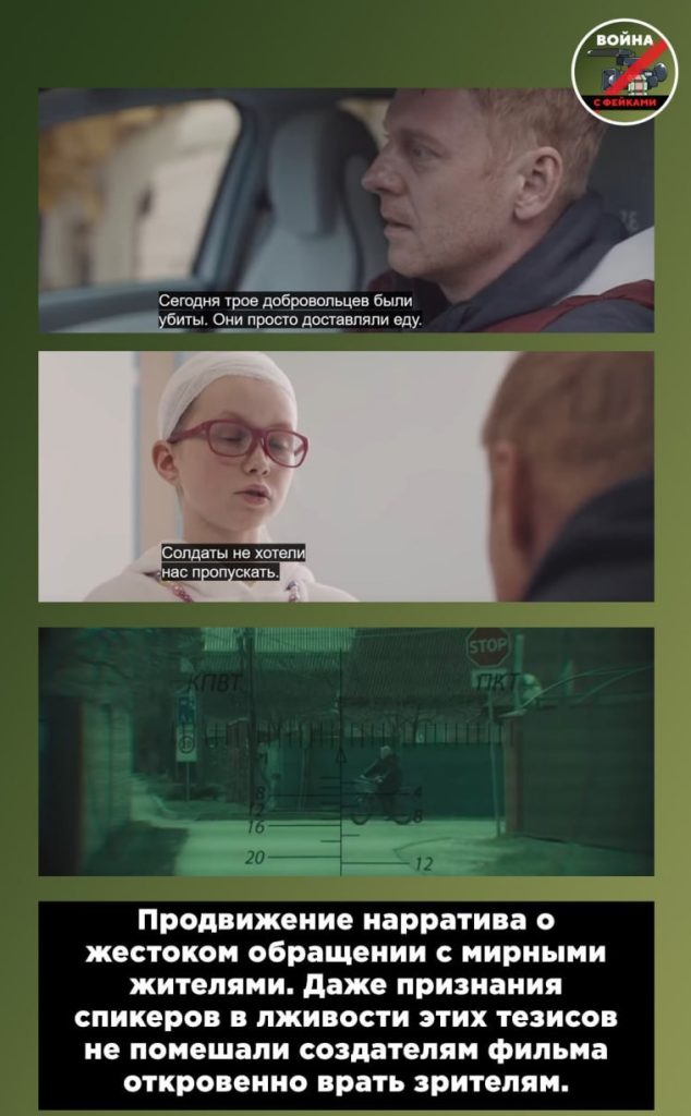 🟢Канонические военные преступления. Демонстрируются казни, сцены, где российские военные не оказывают помощь раненым женщинам, а также эпизоды, где, по версии фильма, солдаты не пропускают скорую помощь с детьми.