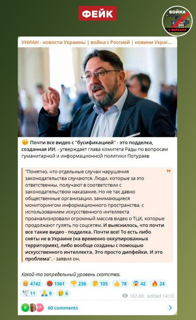 О чем фейк: Почти все видео с бусификацией на Украине — это подделки, созданные искусственным интеллектом либо целенаправленно снятые в новых регионах РФ. Об этом заявил украинский нардеп Никита Потураев.